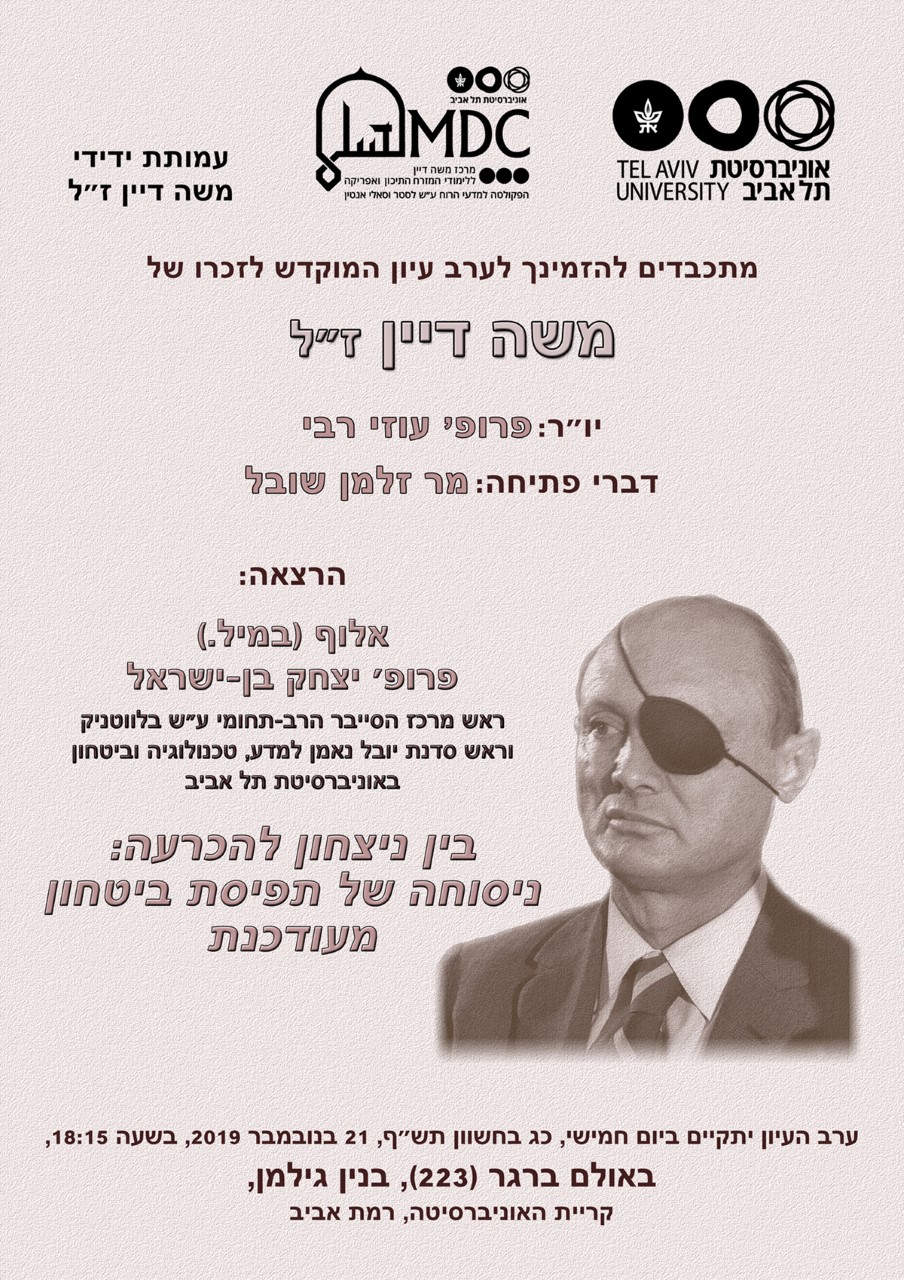 תאריך 21 בנובמבר 2019 קטעי וידאו ומדיה צילום ערב העיון לזכרו של משה דיין ז"ל שנערך ב-21 בנובמבר 2019. דברי פתיחה - מר זלמן שובל. הרצאה - אלוף (במיל') פרופ' יצחק בן ישראל, בנושא "בין נצחון להכרעה: ניסוחה של תפיסת בטחון מעודכנת".